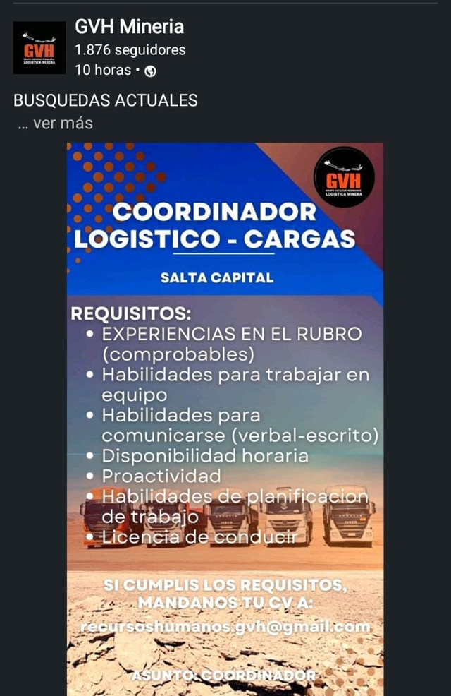 GVH siglas del Grupo Vacazur Hermanos esta dedicado a la logística minera ubicado en Salta. Es una oportunidad única para los trabajadores y emprendedores que sepan del rubro. Uno de los requisitos principales es la experiencia comprobable sin excepción.